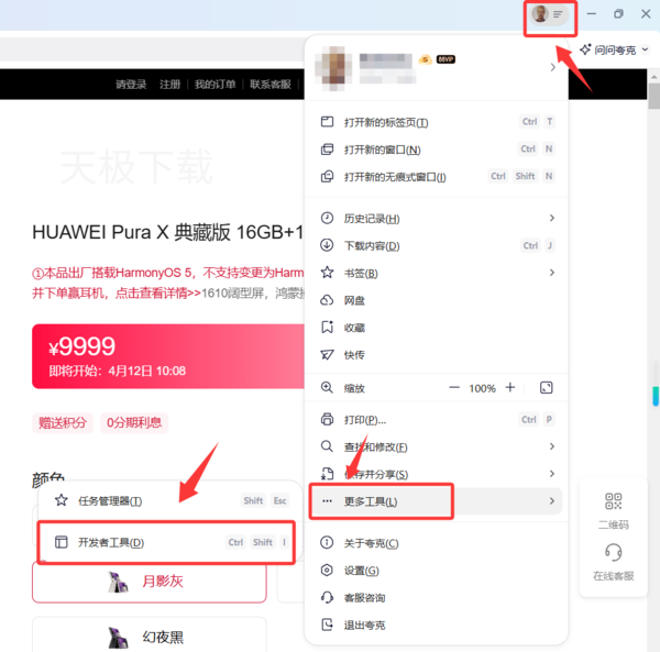 2.点击右上角的【三个横杠】按钮,选择【更多工具】-【开发者工具】;