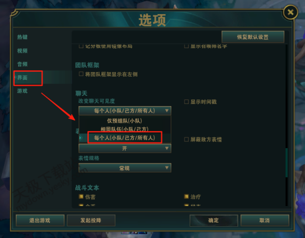 1.下载并打开英雄联盟,进入游戏对局,点击键盘【ESC】调出设置面板,在左侧【界面】找到“改变聊天可见度”,将其改为【每个人(小队/己方/所有人)】。