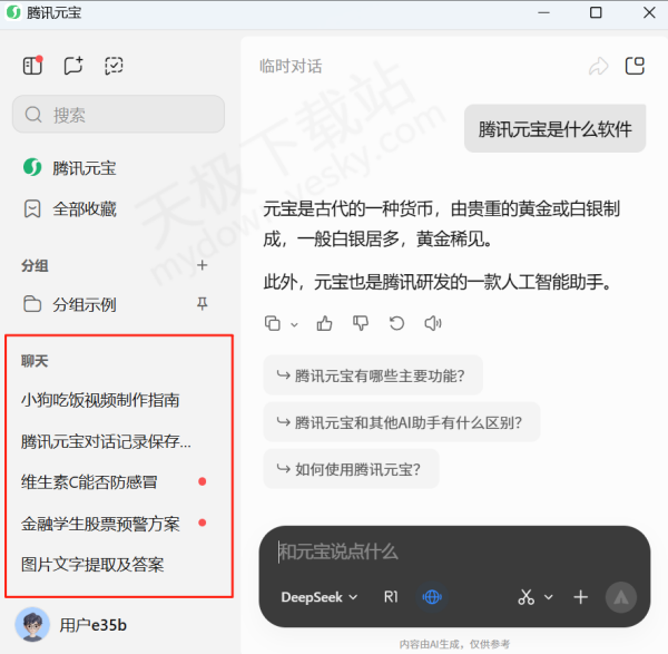 经调查,腾讯元宝电脑版临时对话和普通对话在基础搜索功能上完全一致,像AI模型切换、深度思考分析、联网实时搜索、上传文件解析等核心功能都能正常使用。不过临时对话生成内容后,用户仅能对结果进行复制操作,无法将内容收藏保存,也不支持分享对话链接和导出文档。