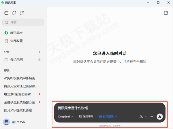 1.下载并打开最新版本的腾讯元宝,点击左上角【进入临时对话】。