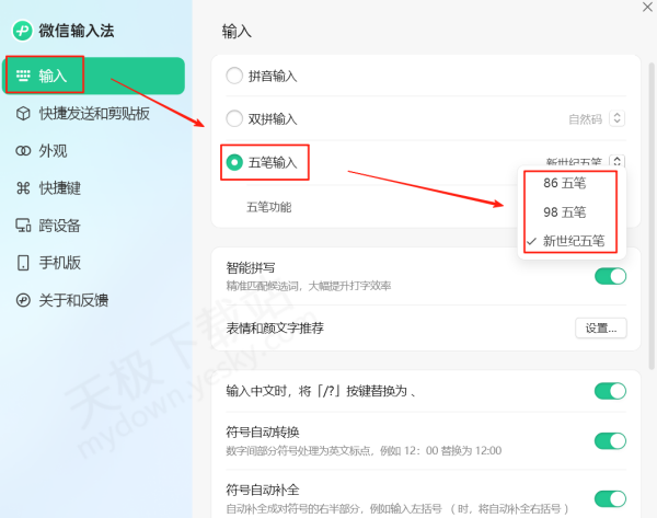 3.进入设置面板后,点击左侧【输入】,在右侧找到【五笔输入】,右侧可选择五笔输入的版本,包含86五笔、96五笔和新世纪五笔。