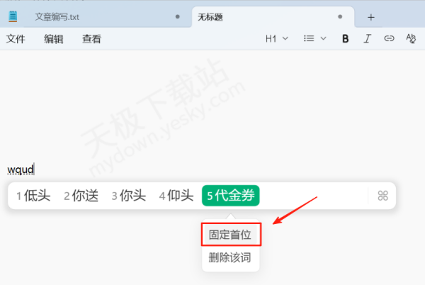 4.切换完成后,五笔模式即可生效。若想提升常用词输入效率,可在打字时右键点击候选词,选择【固定首位】。