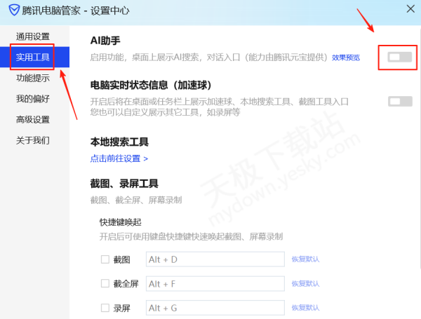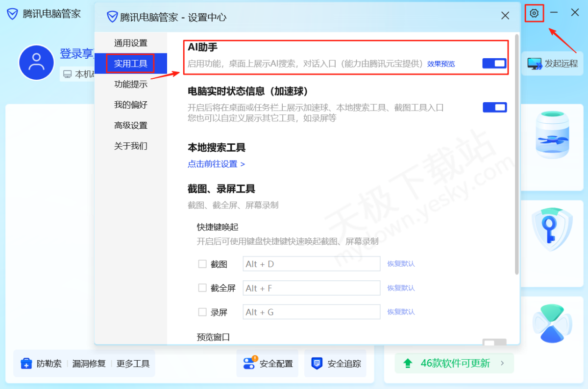1.下载并打开最新版本的腾讯电脑管家,点击右上角【设置】选项,选择左侧【实用工具】,然后把AI助手选项打开。