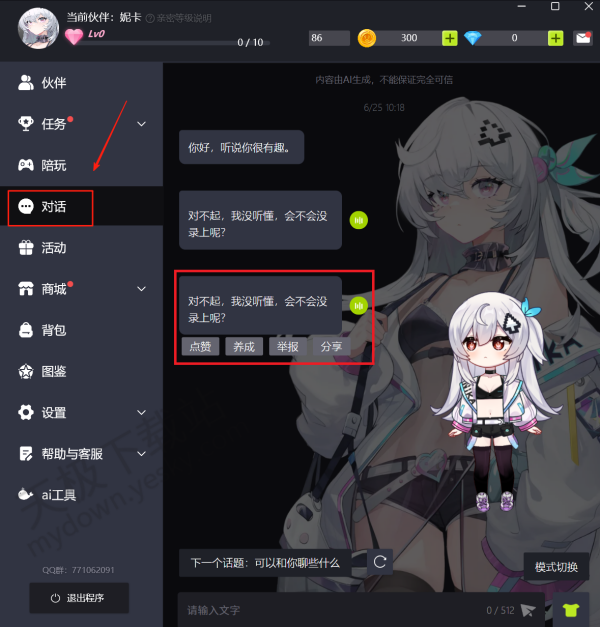 3.在逗逗游戏伙伴的主页面,点击左侧的【对话】选项,你就能查看所有的对话记录,并且可以重复收听游戏伙伴的语音回复。