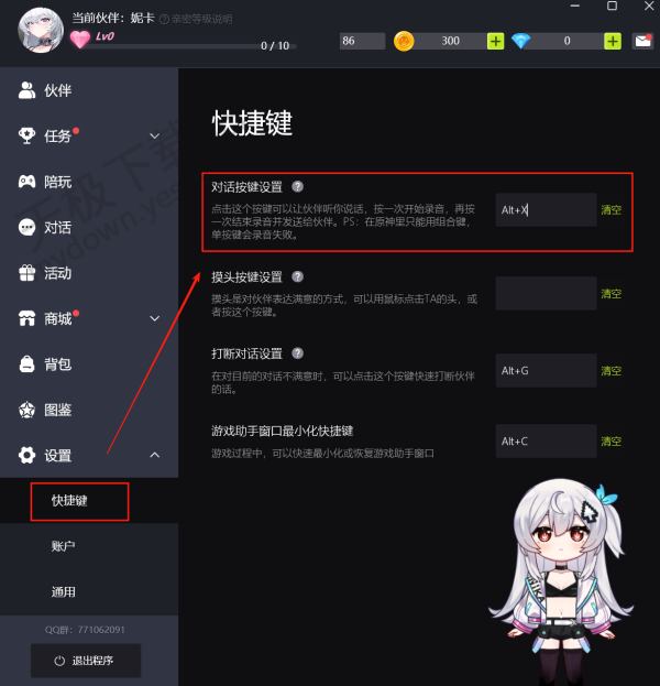 打开逗逗游戏伙伴后,点击左侧菜单栏中的【设置】选项,在展开的设置菜单中选择【快捷键】。此时,在页面右侧的第一行位置,你就可以重新设置语音对话的按键。