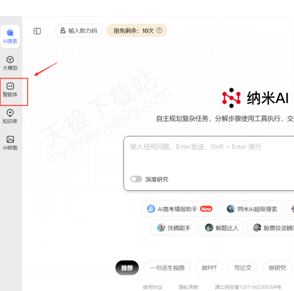 1.下载最新版本的纳米AI,登录账号,点击左侧【智能体】。