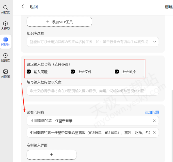 4.然后在下方选择输入框的功能选项,然后可以给智能体设置一个提问示例。