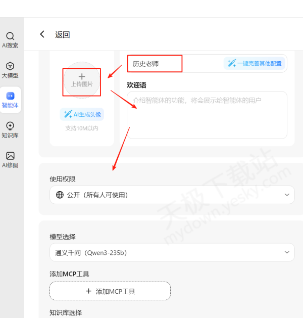 3.在智能体左侧创建页面上方输入名称、欢迎语,并上传图片,在下方可设置智能体的使用权限和模型。