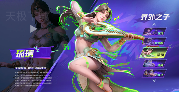 琉璃的背景设定与游戏内的音乐节活动深度绑定,其角色形象以舞台表演者为核心,被塑造为能通过音律操控战场的神秘歌者。官方尚未披露完整背景故事,但从皮肤设计和技能特效推测,她可能是来自异次元的音律使者,通过音乐能量影响现实世界的战斗规则。在游戏世界观中,她与其他"界外之子"共同参与碎片宇宙的对抗,利用独特的音波能力改变战局。
