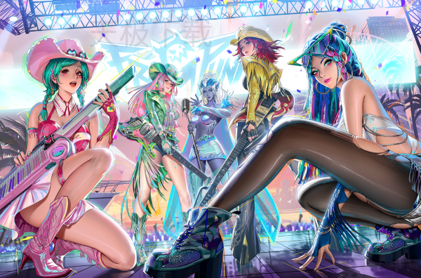 调音大师(史诗级):亮粉色打歌服设计,武器变形为DJ台,技能释放时伴随霓虹光效和电子音乐节拍。