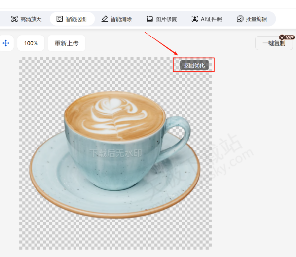 4.上传完成后,AI 会自动识别图片内容并进行抠图操作。如果对自动抠图的效果不满意,可点击右上角的【抠图优化】。