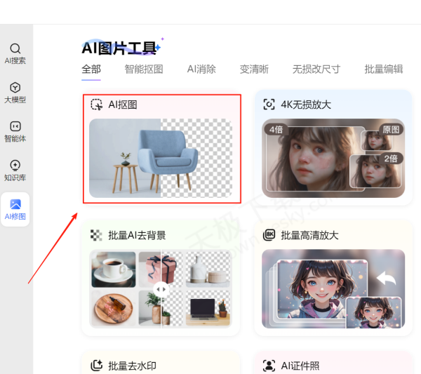 2.进入AI修图页面后,在页面下方找到【AI抠图】工具并点击。