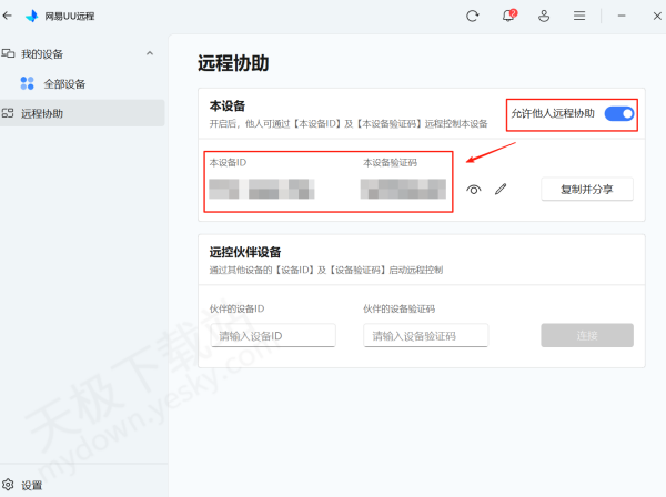 1.下载并打开最新版本的网易UU远程,点击左侧【远程协助】,勾选右侧【允许他人远程协助】,然后把下方的设备码和验证码发送到手机端。