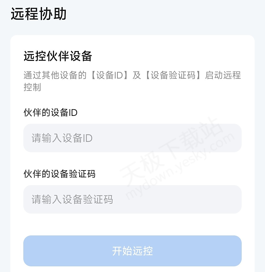 2.在手机端点击【远程协助】,输入设备码和验证码,点击【开始远控】。