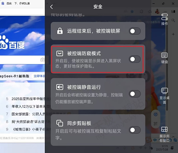 4.找到【被控端防窥模式】,将其打开,这样电脑端的屏幕就会显示黑屏了。