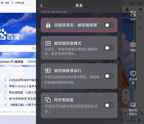 经调查,网易UU远程电脑版还可以设置“退出远控后自动锁屏”,具体方法为:进入手机控制端,点击【操作】-【安全】,将上方【远控结束后,被控端锁屏】选项打开。